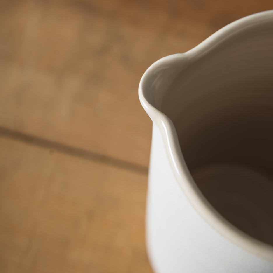 We love the elegant and timeless shape of this jug for fruit juice at the breakfast table or lashings of gravy with our Sunday roast. In soft white it is a simple and classic addition to any table, whether it is a rustic country farmhouse or a minimalist modern penthouse. A fabulous hand thrown stoneware and porcelain tall jug made in South West France.